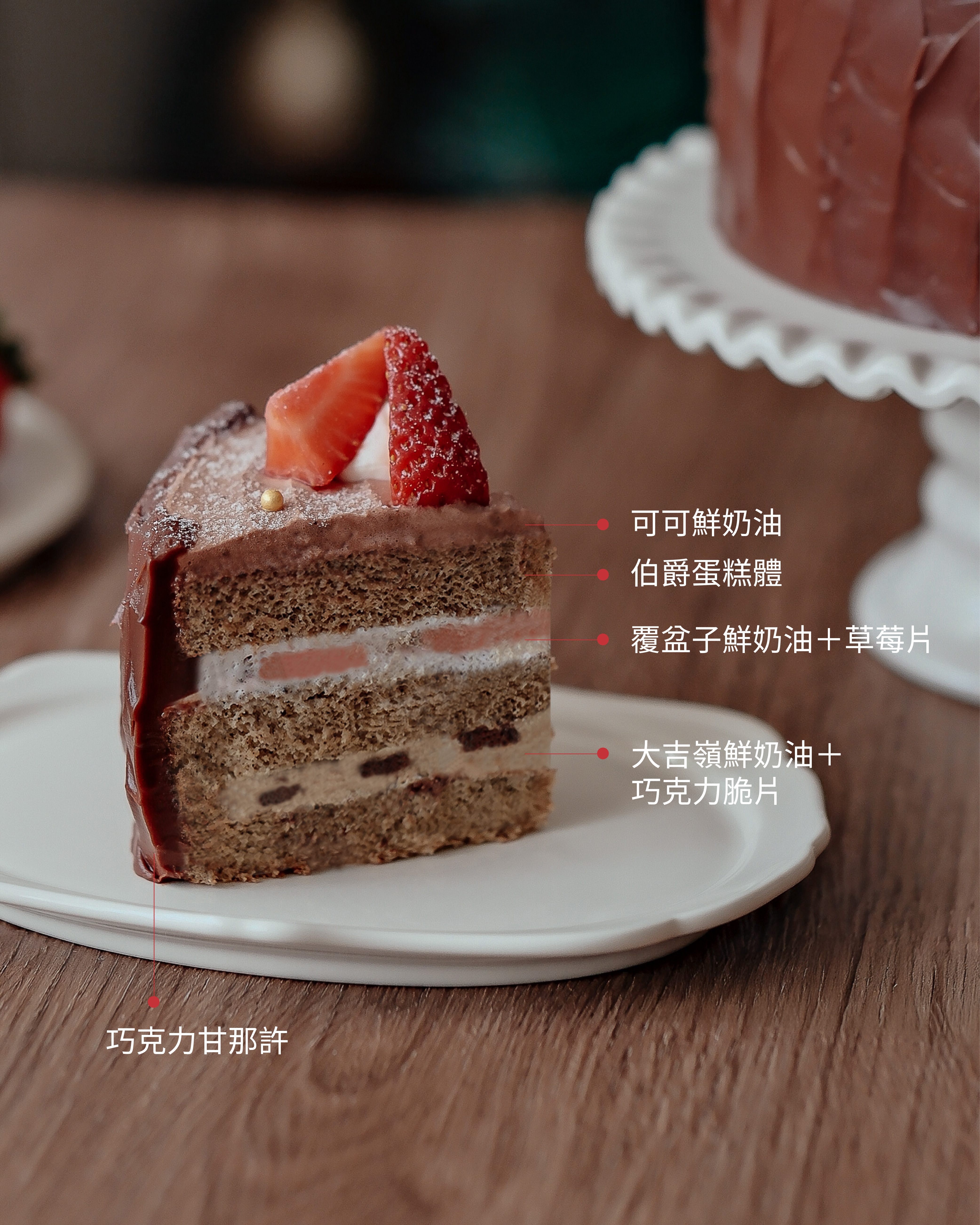 柔軟的伯爵戚風蛋糕體搭配可可鮮奶油,搭配覆盆子鮮奶油與新鮮草莓夾層,營造出酸甜的清爽滋味。底層選用別具特色的大吉嶺鮮奶油與巧克力脆片,帶來口感上的驚喜,再以巧克力甘那許包覆整體,增添濃郁的風味。