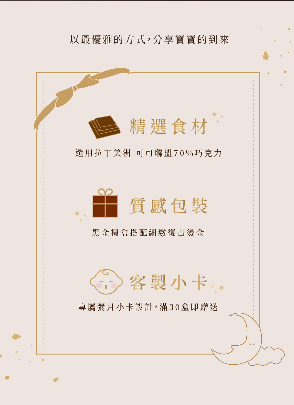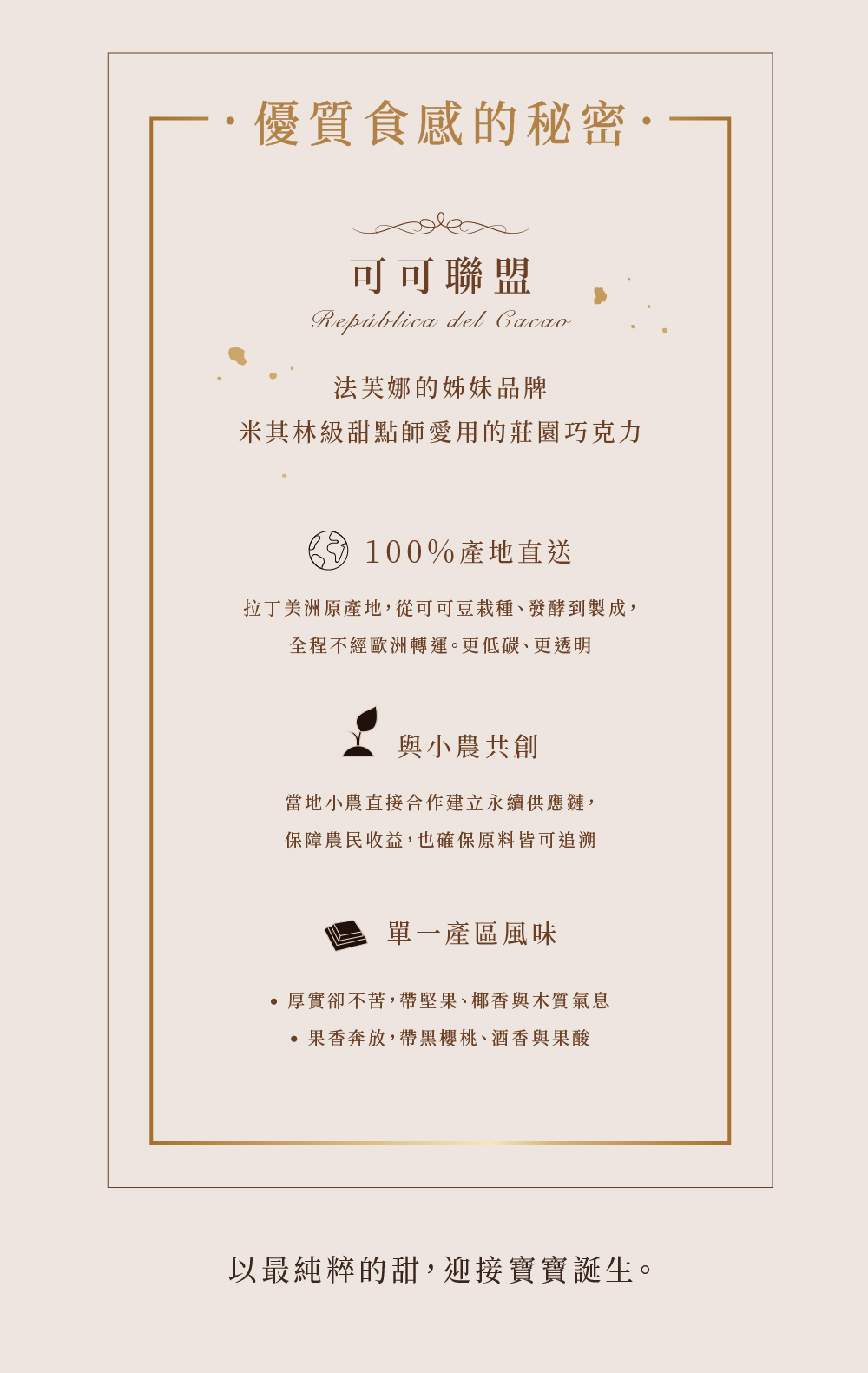 以精緻貴氣的黑金配色搭配復古燙金元素,打造質感抽屜式外盒,致敬莊園巧克力的經典生產工法與純淨天然。將「美味經得起時間考驗」的信念融入其中。如時間流動中留下的風味痕跡。低調中蘊含分量,讓每一次打開抽屜,都是慢下來品嚐的儀式。