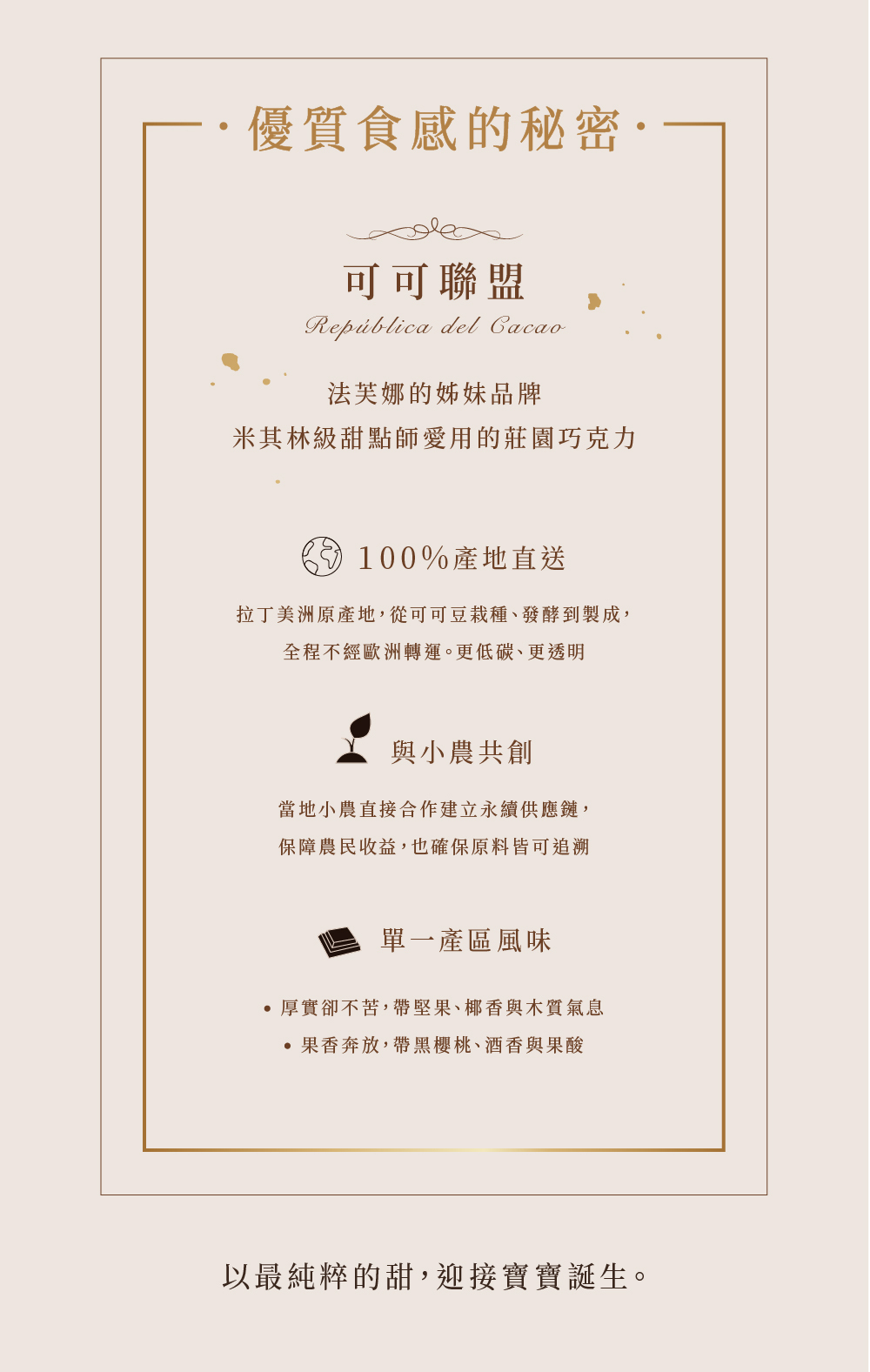 以精緻貴氣的黑金配色搭配復古燙金元素,打造質感抽屜式外盒,致敬莊園巧克力的經典生產工法與純淨天然。將「美味經得起時間考驗」的信念融入其中。如時間流動中留下的風味痕跡。低調中蘊含分量,讓每一次打開抽屜,都是慢下來品嚐的儀式。