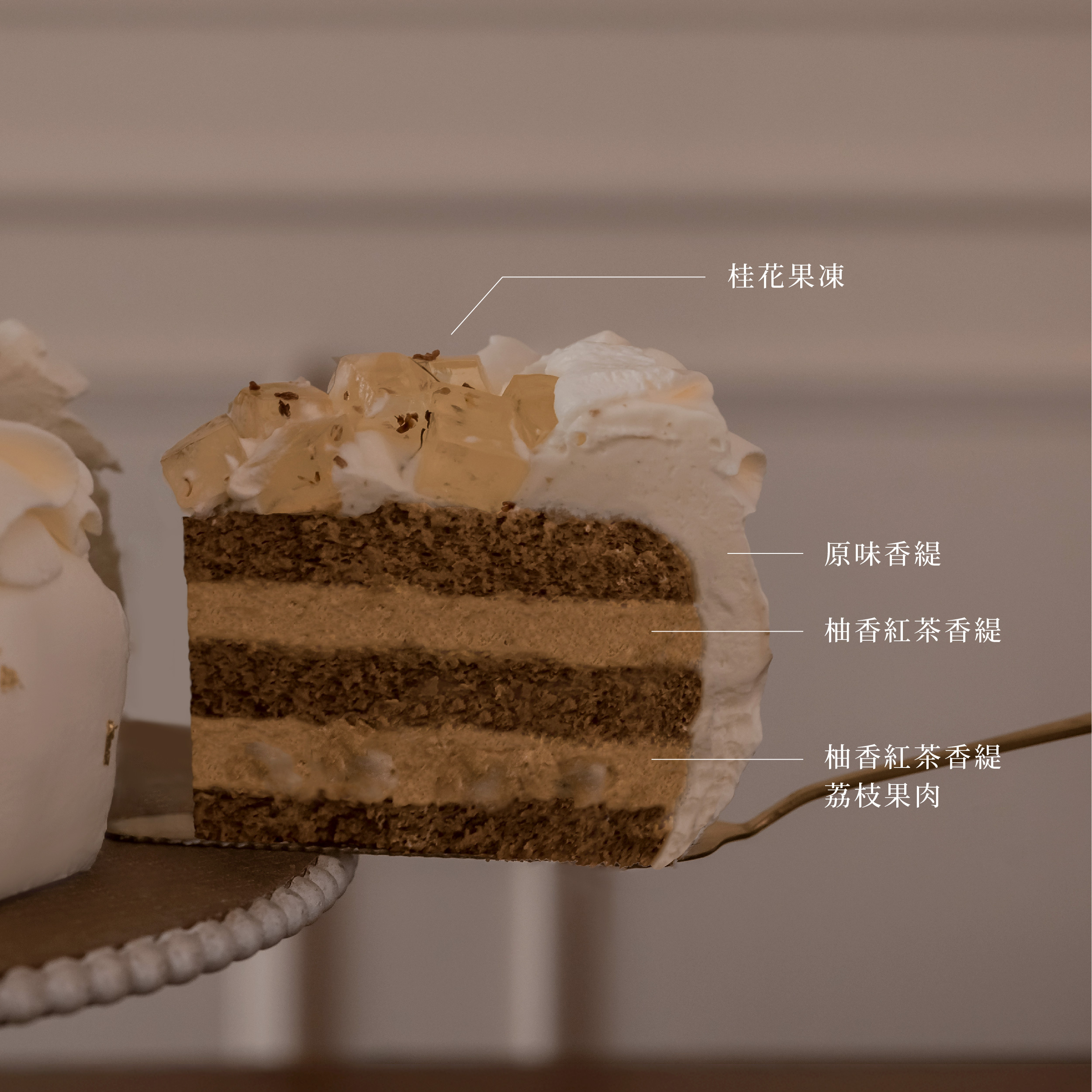 鬆軟的戚風蛋糕中,包裹著荔枝的果香與柚花紅茶的淡雅, 交織出如晨光般溫柔的層次。